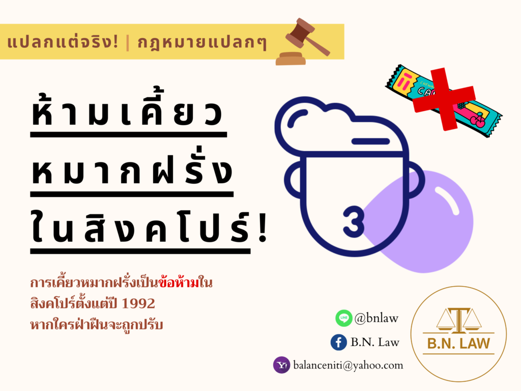 สิงคโปร์นั้นเป็นที่รู้จักกันดีในเรื่องของกฎหมายที่เข้มงวดเพื่อรักษาสันติภาพและความสงบเรียบร้อย หนึ่งในเรื่องกฎหมายที่ค่อนข้างแปลกของสิงคโปร์คือ “ห้ามเคี้ยวหมากฝรั่ง” เว้นแต่ว่าจะเป็นการใช้ในเชิงแพทย์ และ “ห้ามขายหมากฝรั่ง” เช่นกัน (โดยภายหลังได้มีการอนุมัติให้ขายหมากฝรั่งได้) เพื่อขจัดปัญหาหมากฝรั่งเหนียวติดตามสถานที่ต่างๆ ไม่ว่าจะเป็นตามเก้าอี้ โต๊ะ ลิฟต์ และที่สาธารณะอื่นๆ